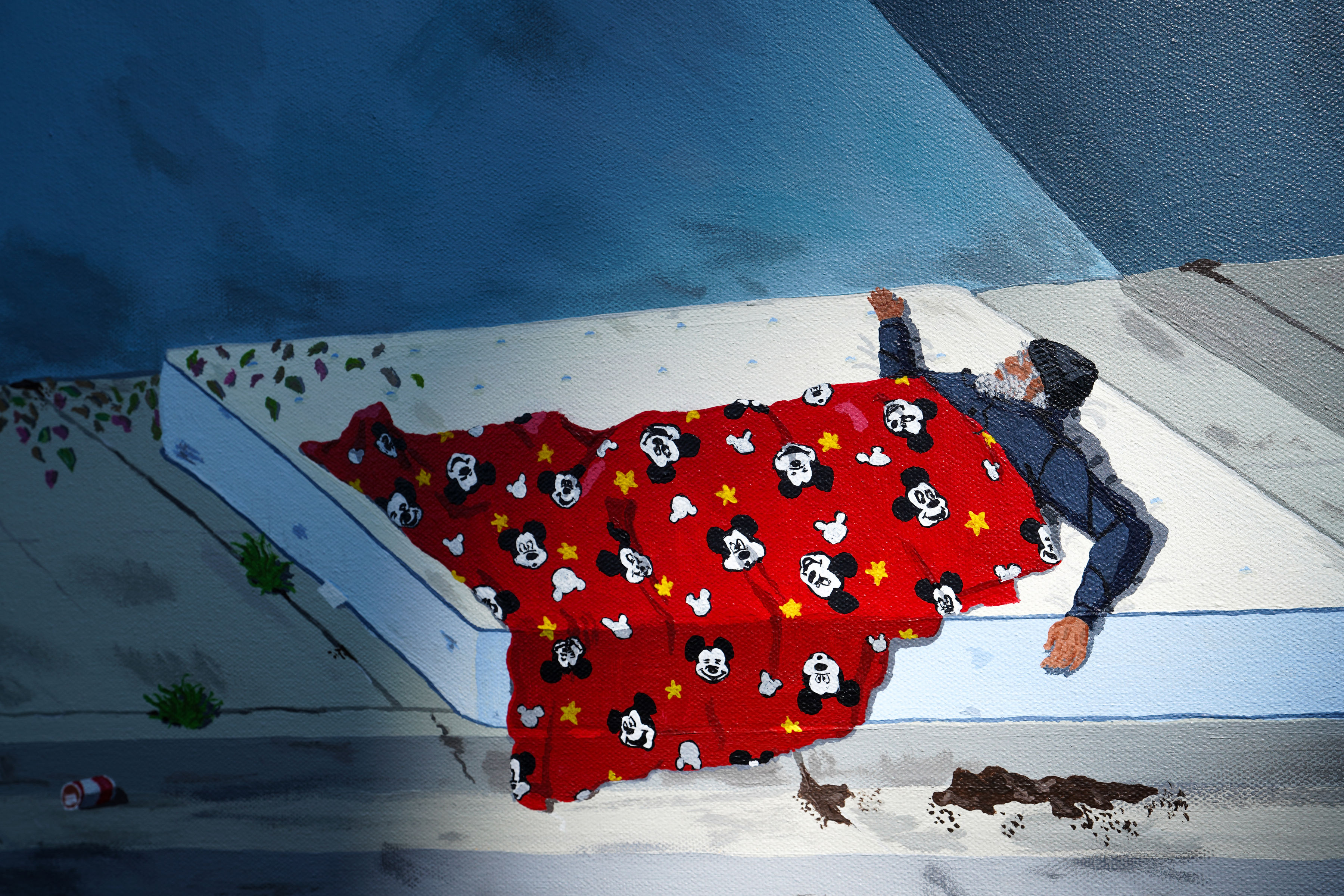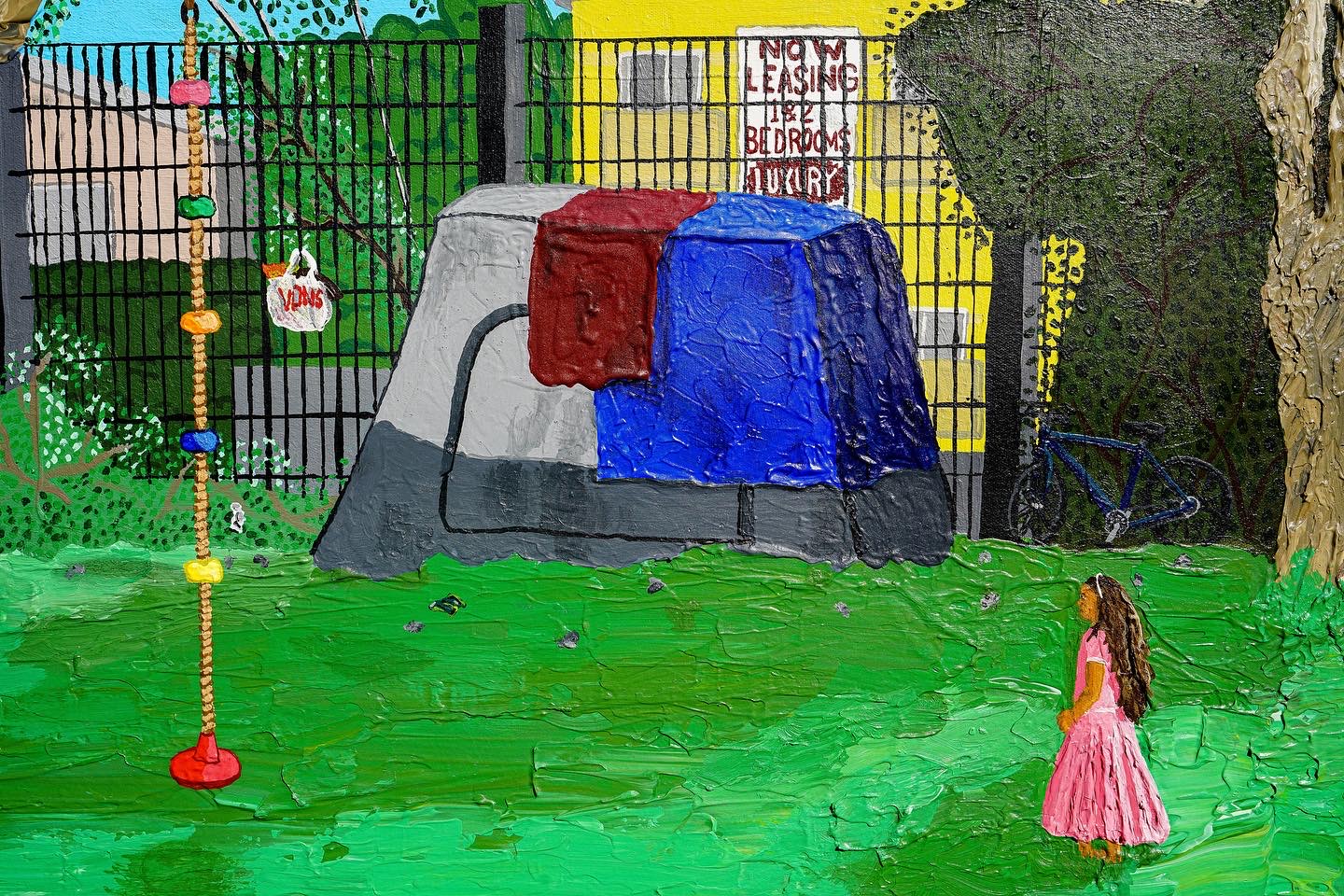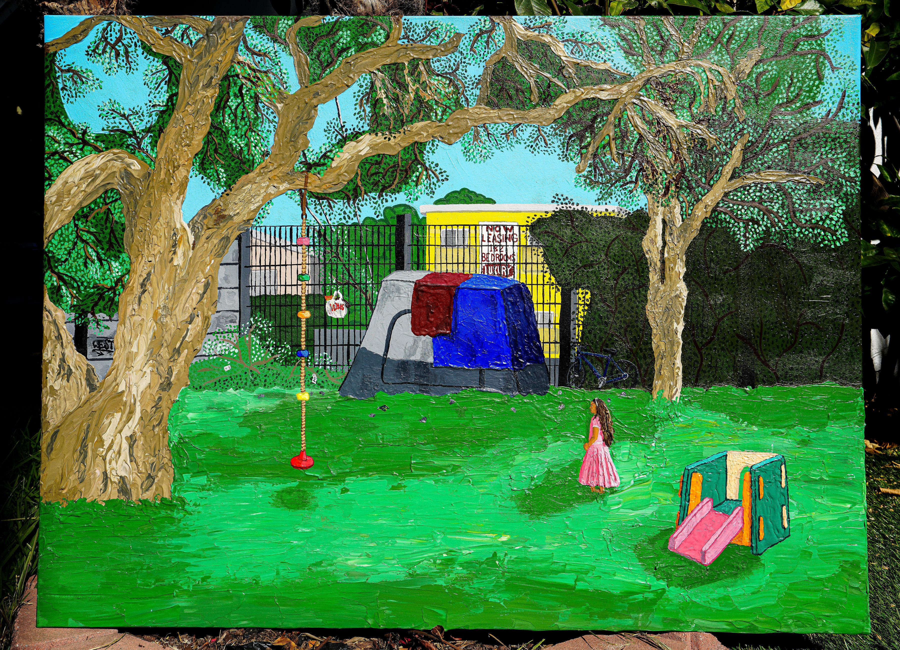 This piece is loosely based off the quiet corner of my local park. Like many parks in LA, it has become home to many houseless people for years now. As I created this work, I kept thinking about how a child must first perceive the reality of homelessness and our nation’s blantantly obvious wealth gap. What effect does this societal “norm” have on the psyche of the youth as they develop?