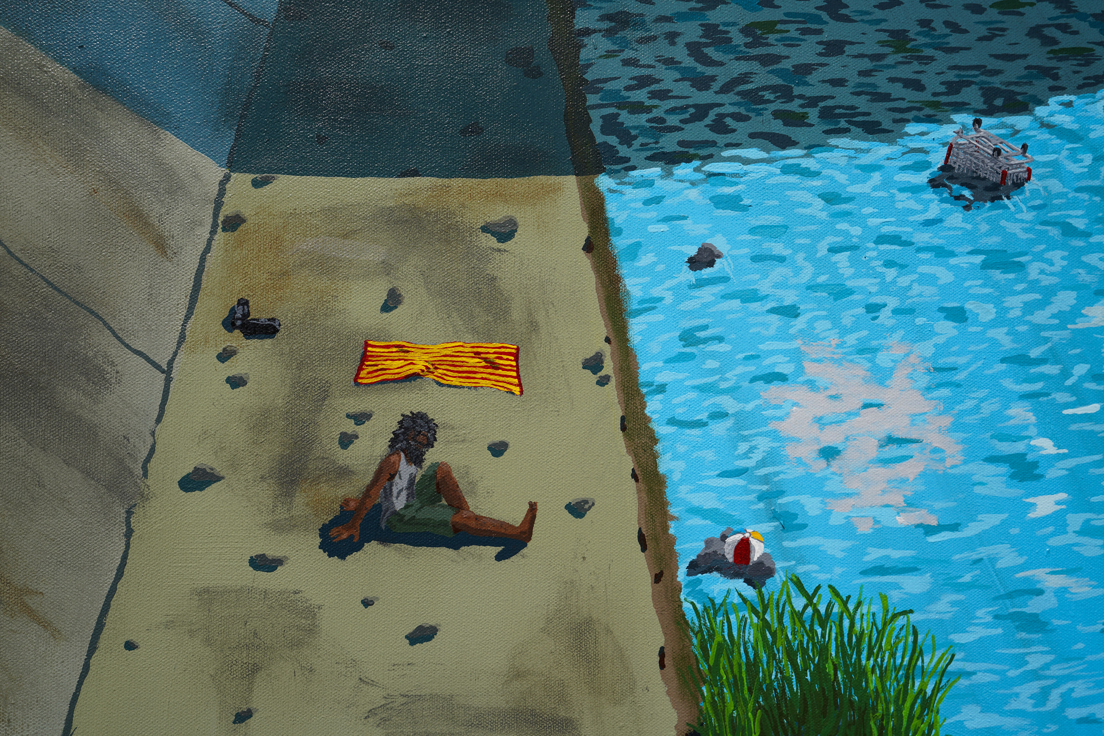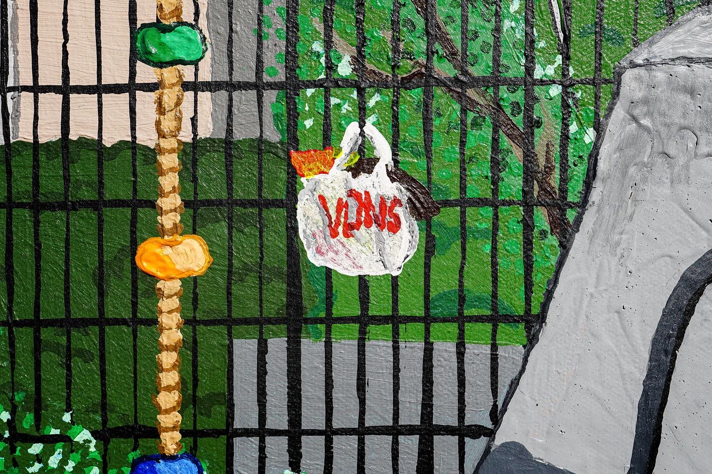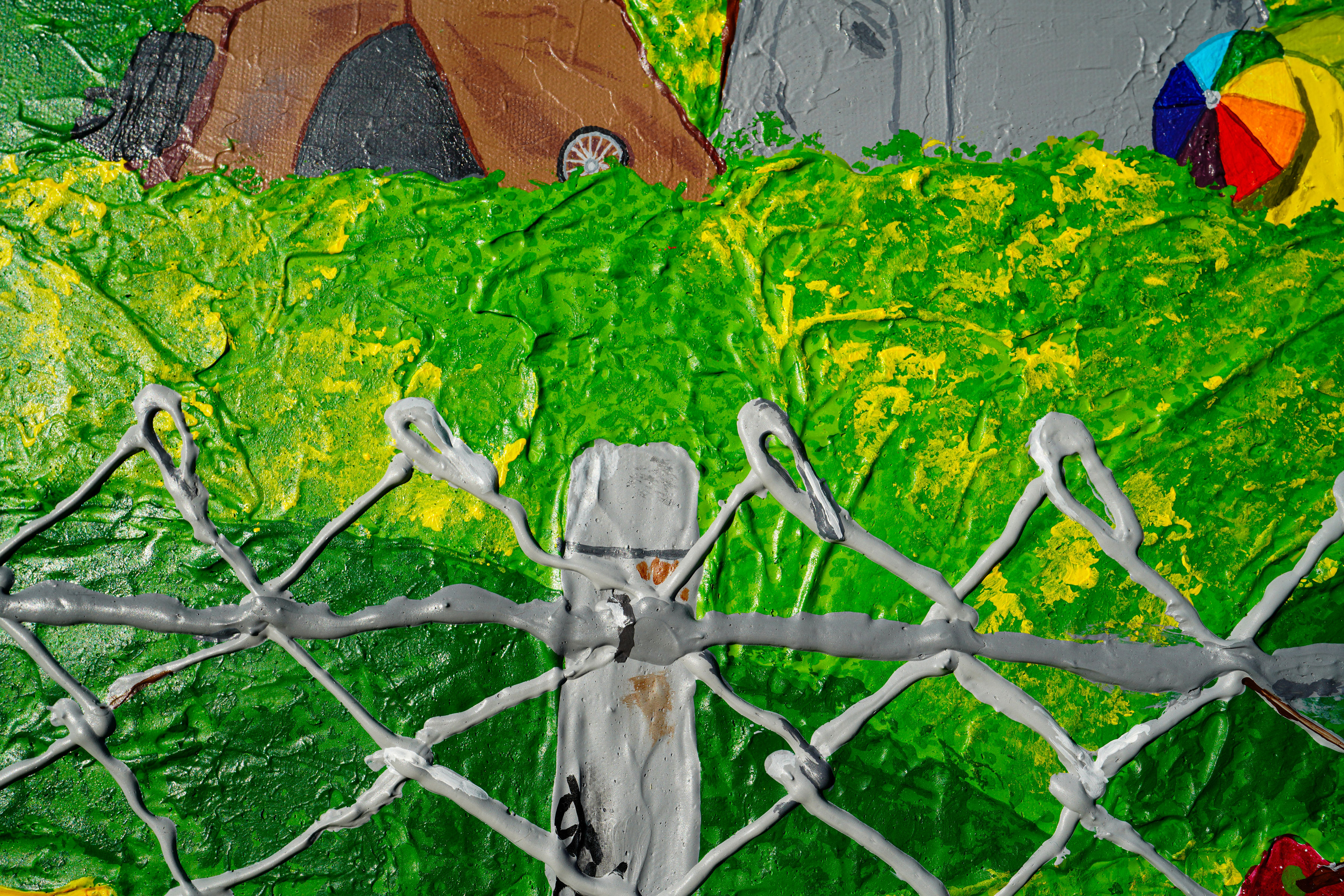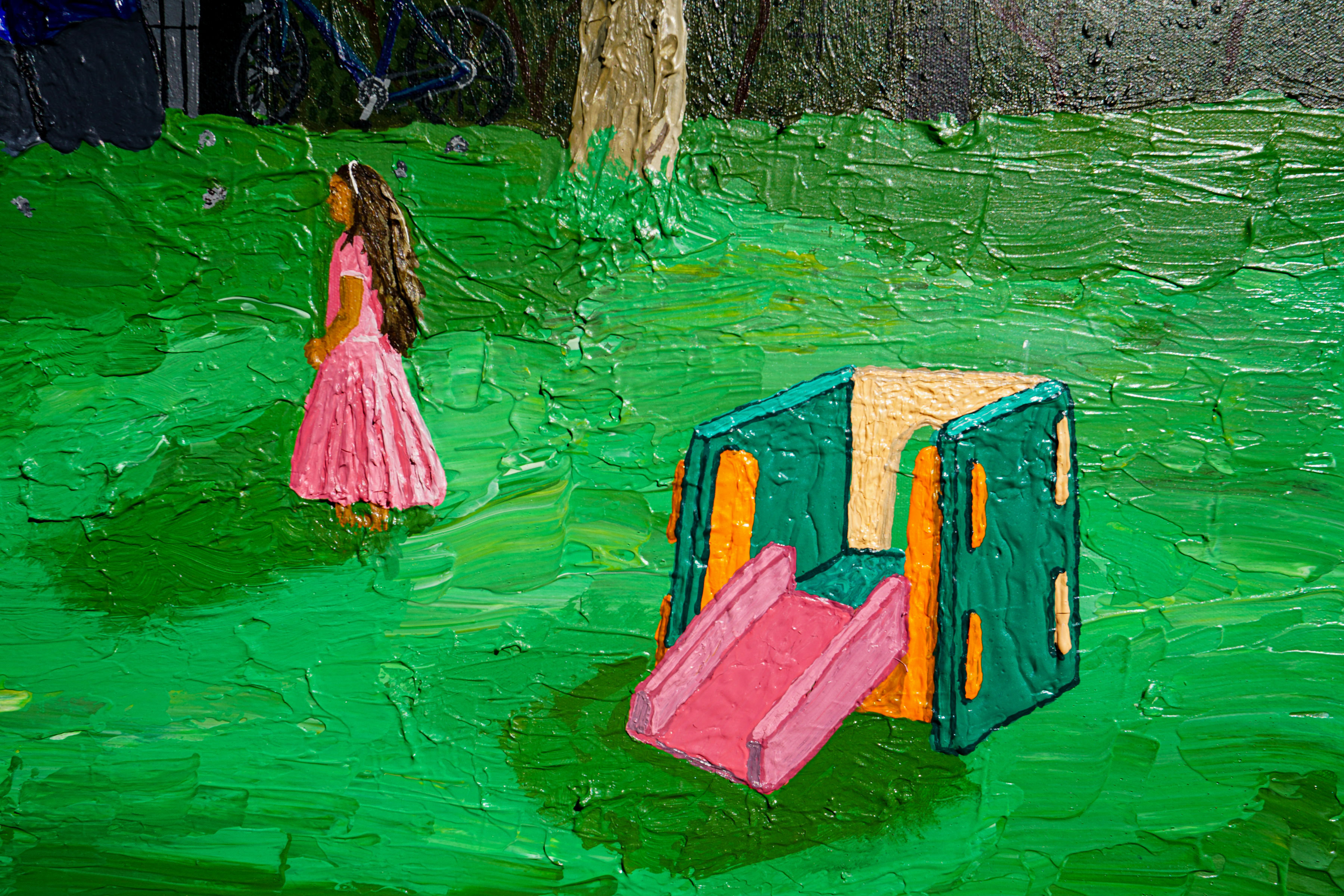 This piece is loosely based off the quiet corner of my local park. Like many parks in LA, it has become home to many houseless people for years now. As I created this work, I kept thinking about how a child must first perceive the reality of homelessness and our nation’s blantantly obvious wealth gap. What effect does this societal “norm” have on the psyche of the youth as they develop?