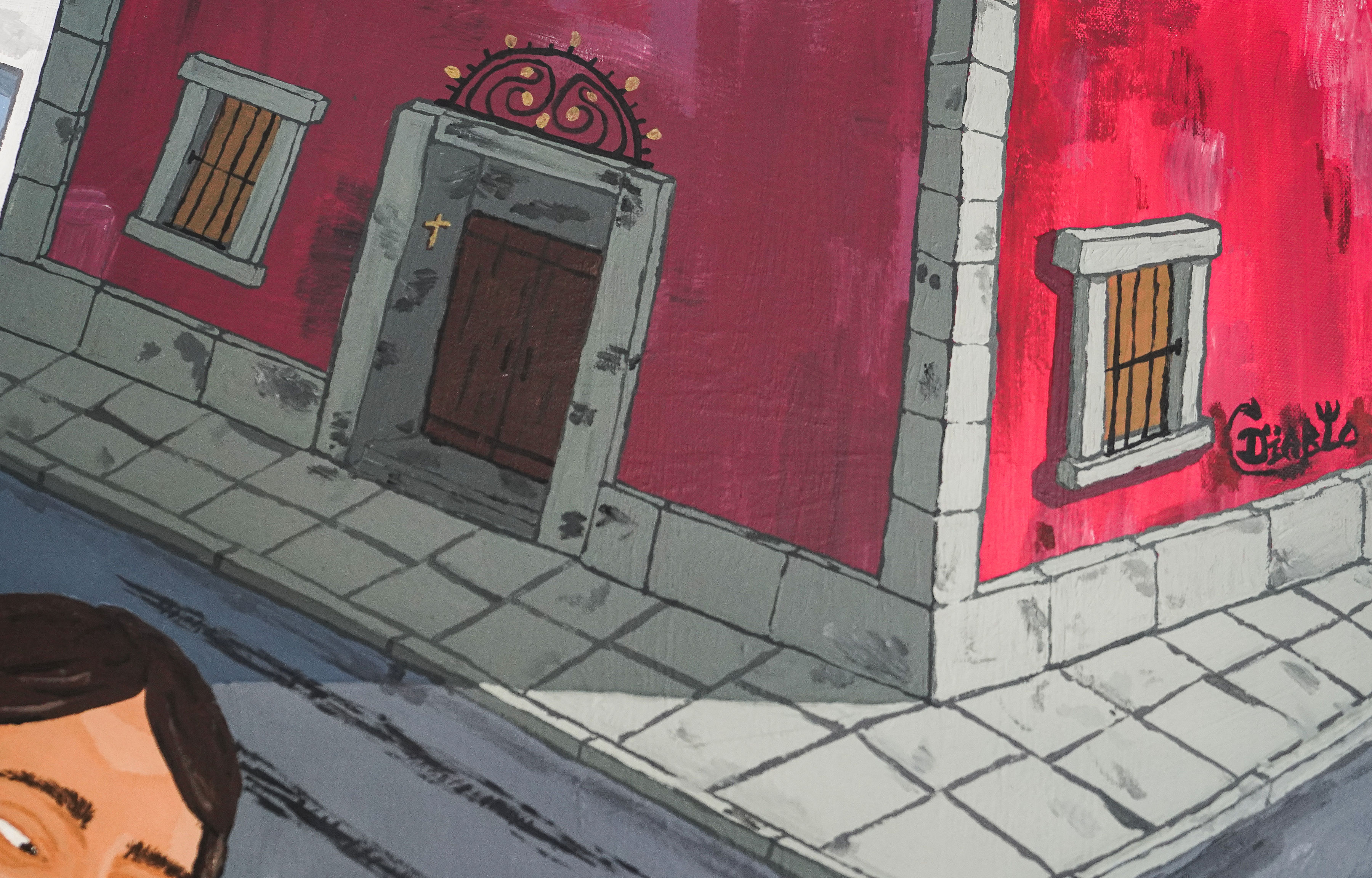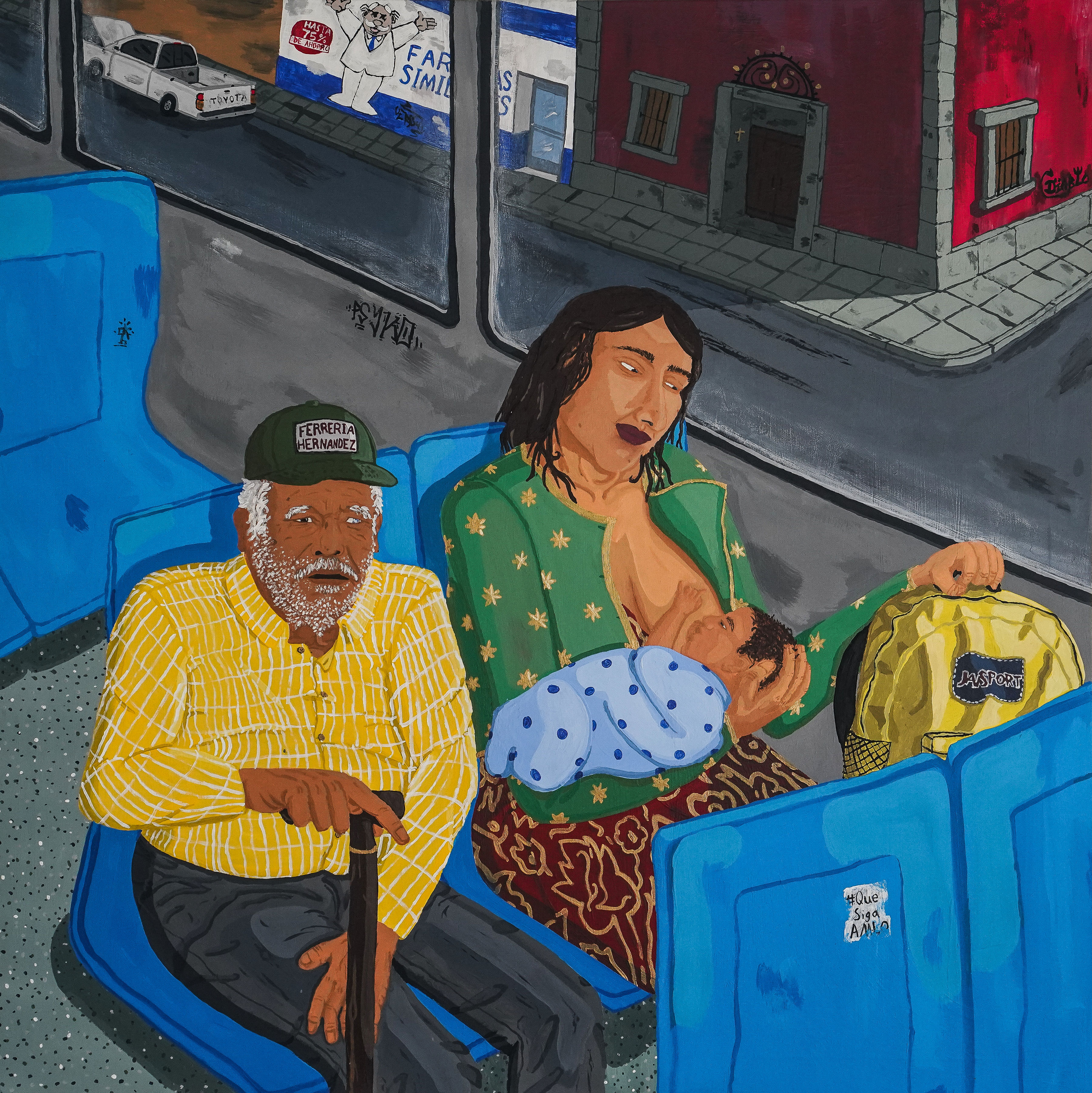 Informed by my extensive solo travel across Mexico, La Virgen moderna is an ode to the central, yet often neglected role of women in Mexican society. The main homemaker and caretaker is depicted amidst the backdrop of an ailing population, unstable economy, and corrupt political sphere. By referencing examples of common cultural and religious iconography, the painting addresses the duality between la Virgen de Guadalupe as an omnipresent symbol of protection, purity and hope, and the generationally-imposed standards Mexican women face throughout their lives.