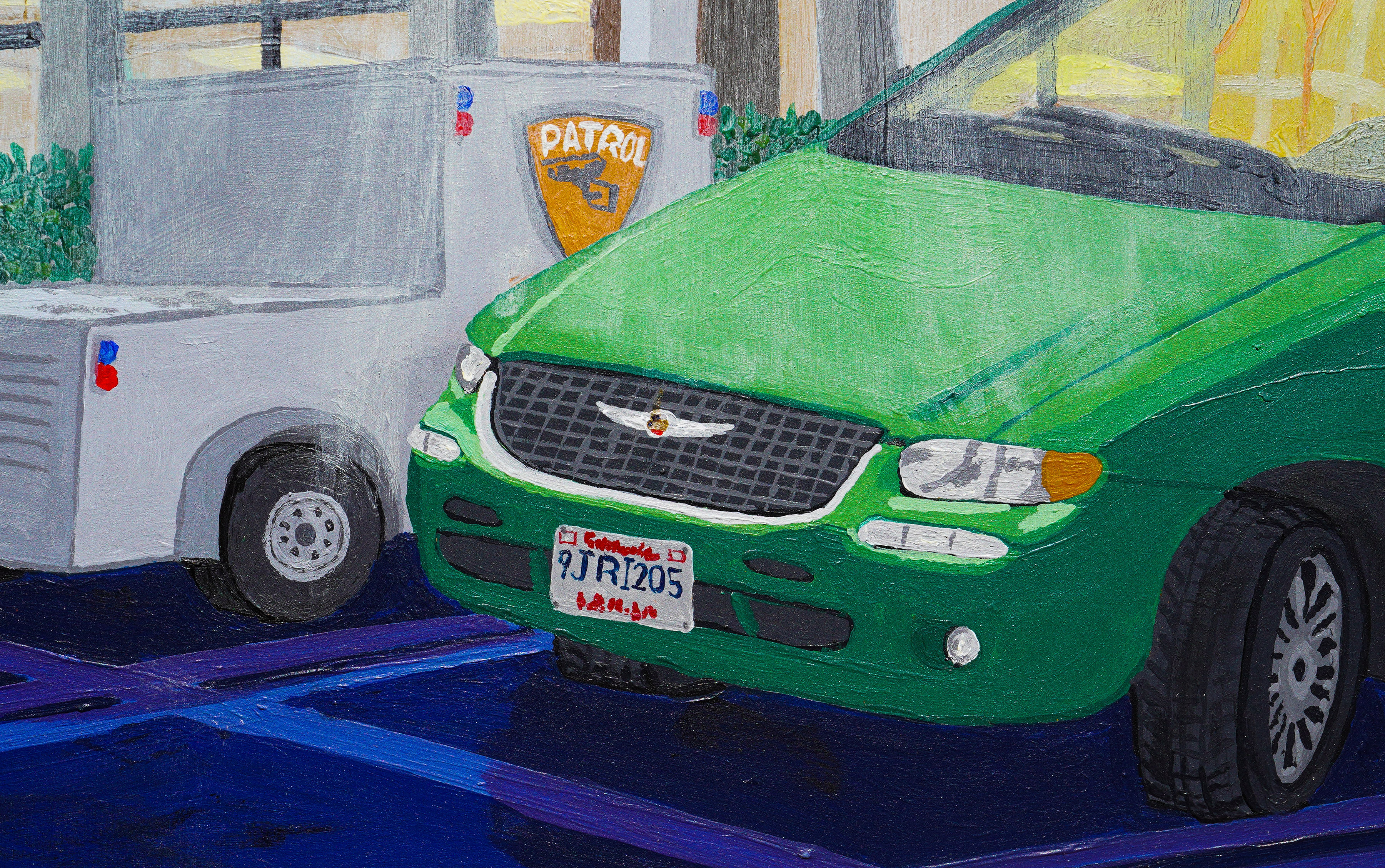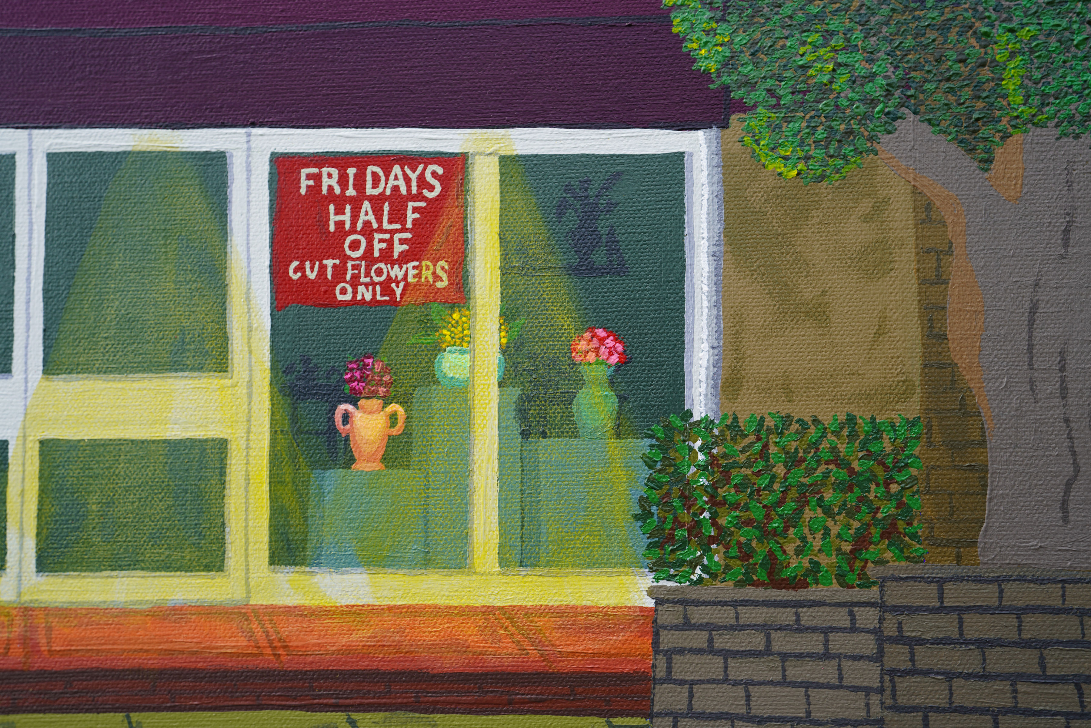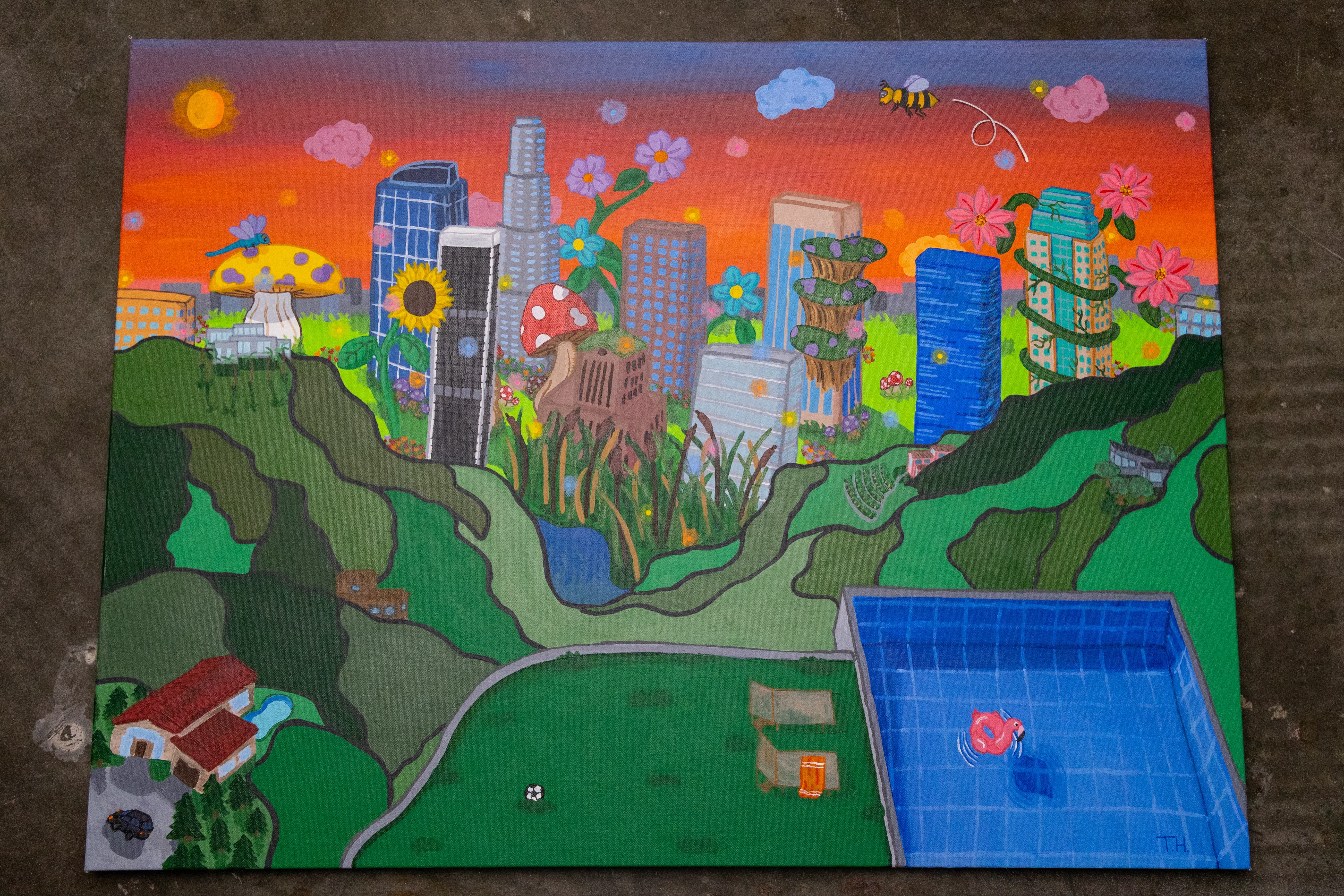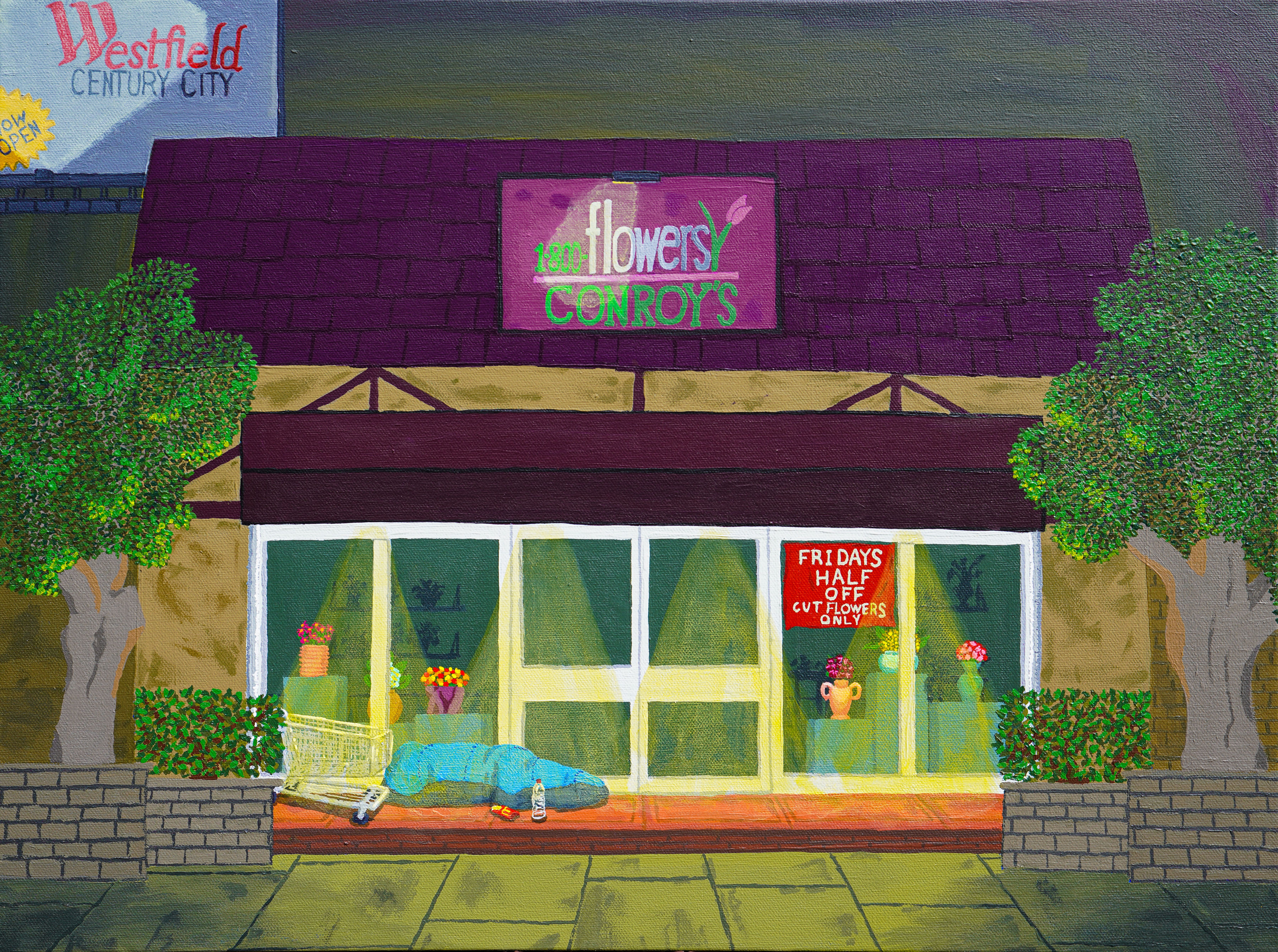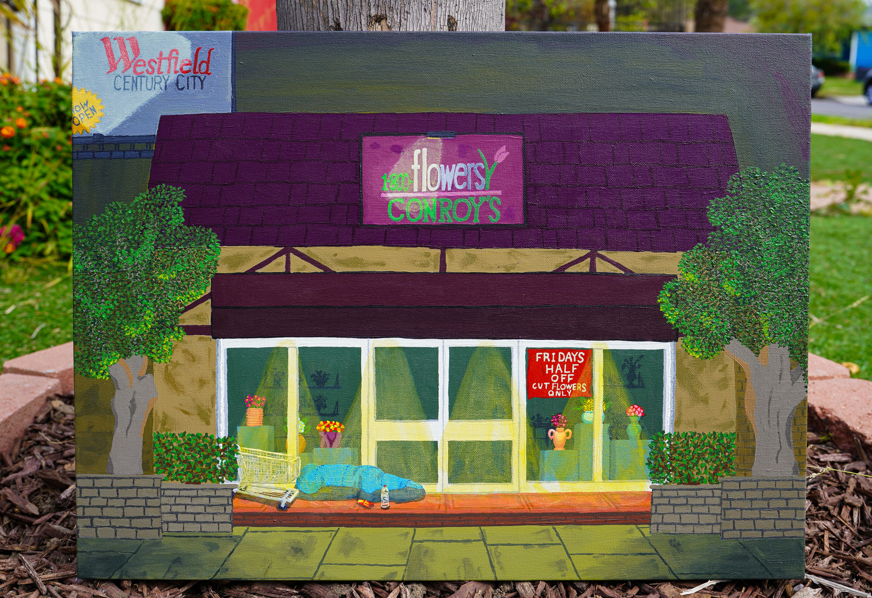 Based off a flower shop near the Beverly Hills Shopping Complex, “Cut Flowers” alludes to the intersections between homelessness and consumerism in Los Angeles. The painting portrays a far-too-common sight of a houseless person sleeping beneath the harsh light of a storefront with their few belongings out on display. The use of signs and familiar iconography contextualizes the piece in LA’s culture of hyper-consumerism; a city where the act of buying in excess is considered second-hand nature, yet far too few can afford such a lifestyle.