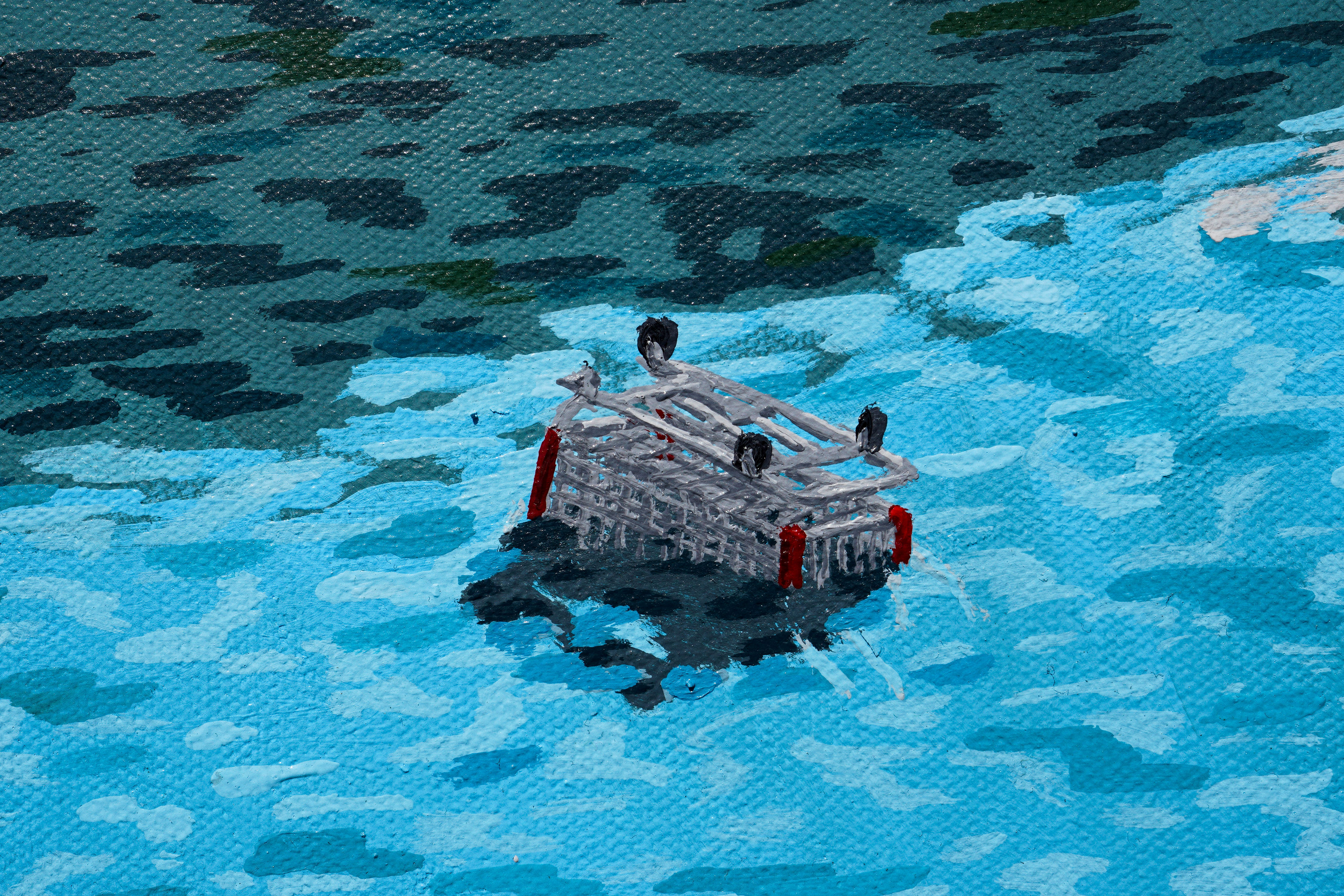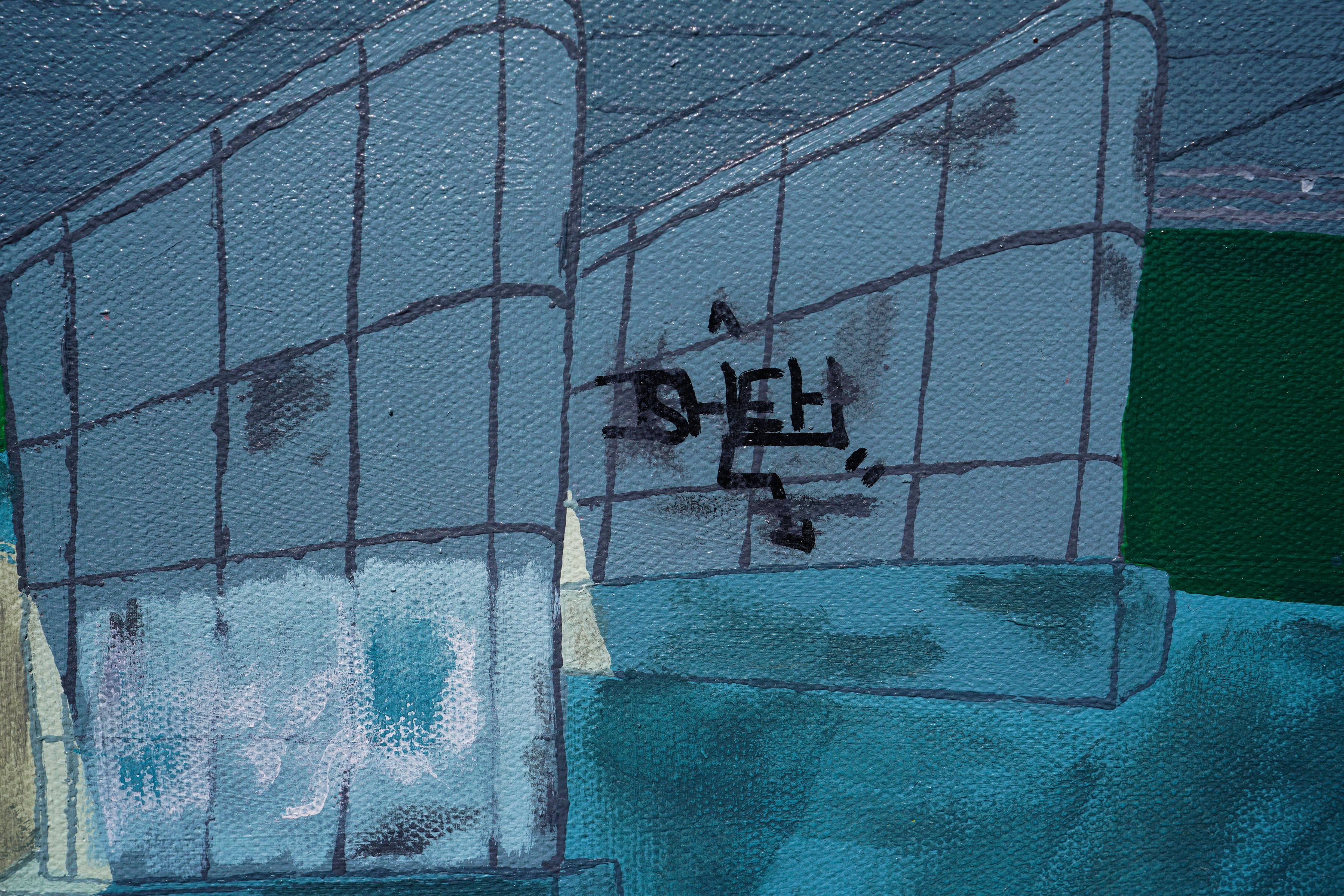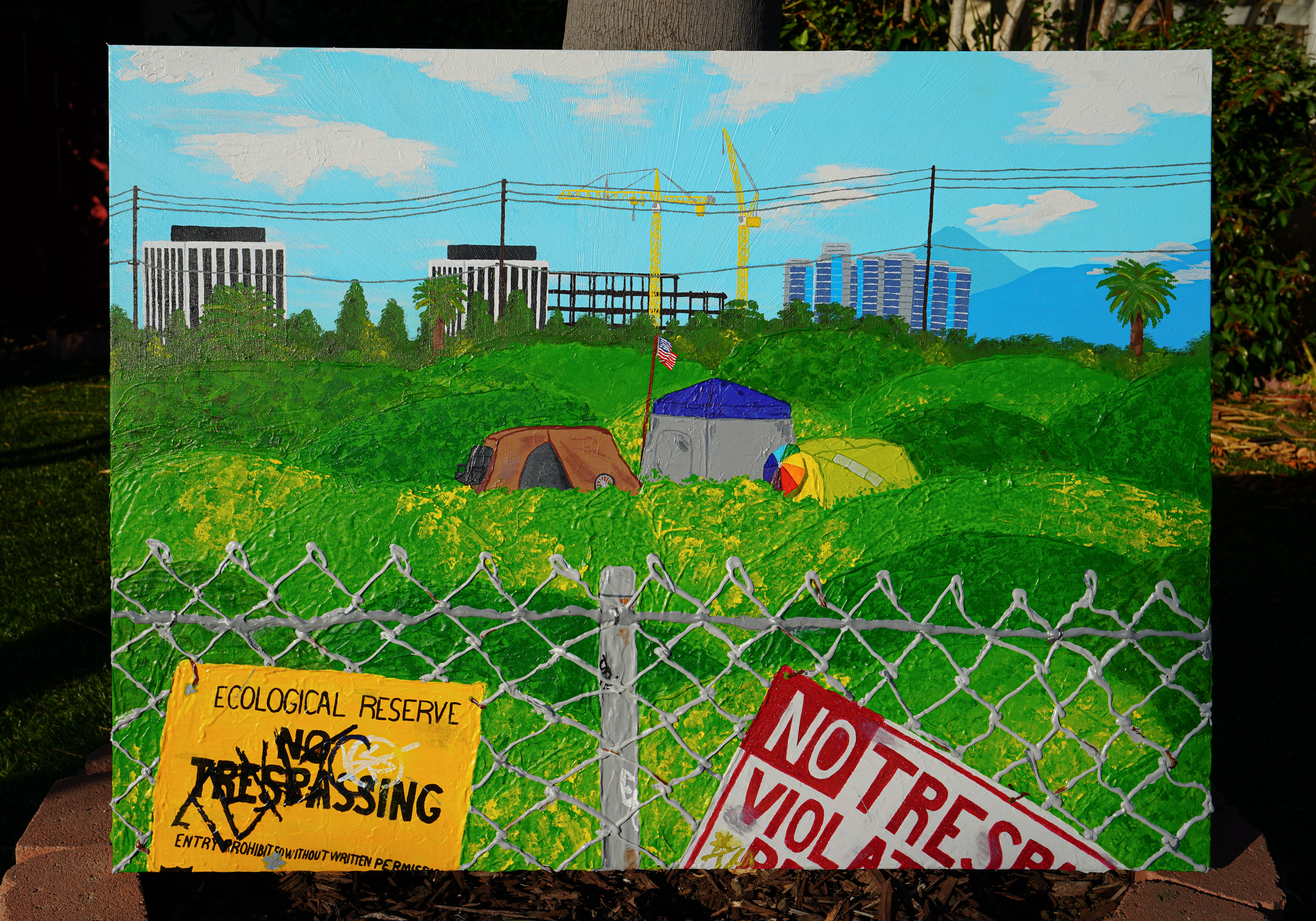 While the Ballona Creek may be a somewhat serene escape for many (including me) in the midst of the Westside sprawl, it is also home to many Angelenos who’ve taken residence under its many overpasses or, as is illustrated in this painting, within or near the Ballona Wetlands Ecological Preserve. The new luxury apartment/condo construction in the background provides a stark contrast to the lived experience of the Creek’s residents. Much of this series explores the relationship between public infrastructure and homelessness. While ample funds flow towards the construction of luxury housing, the city’s poorest are left to make alternative, often substandard, use of public lands and structures as a means of refuge and subsistence.