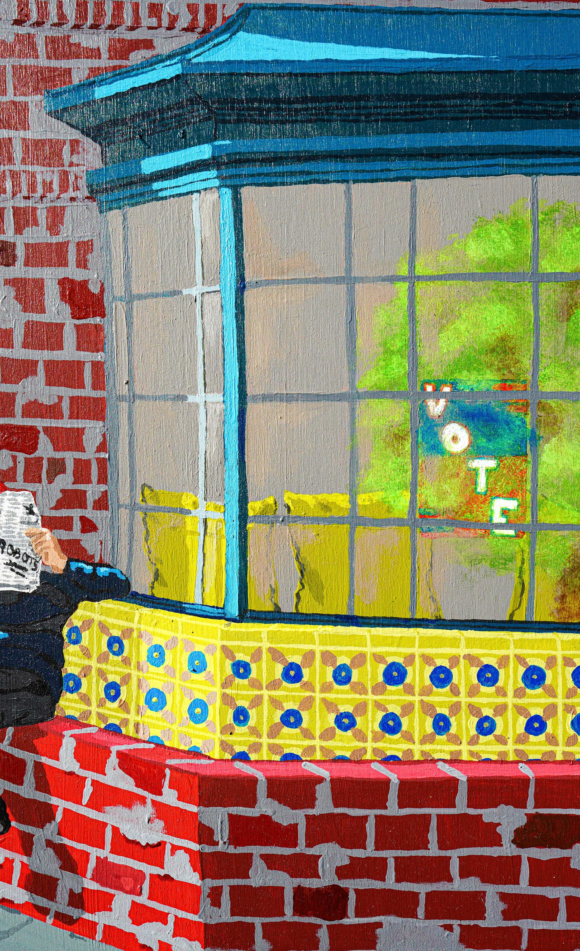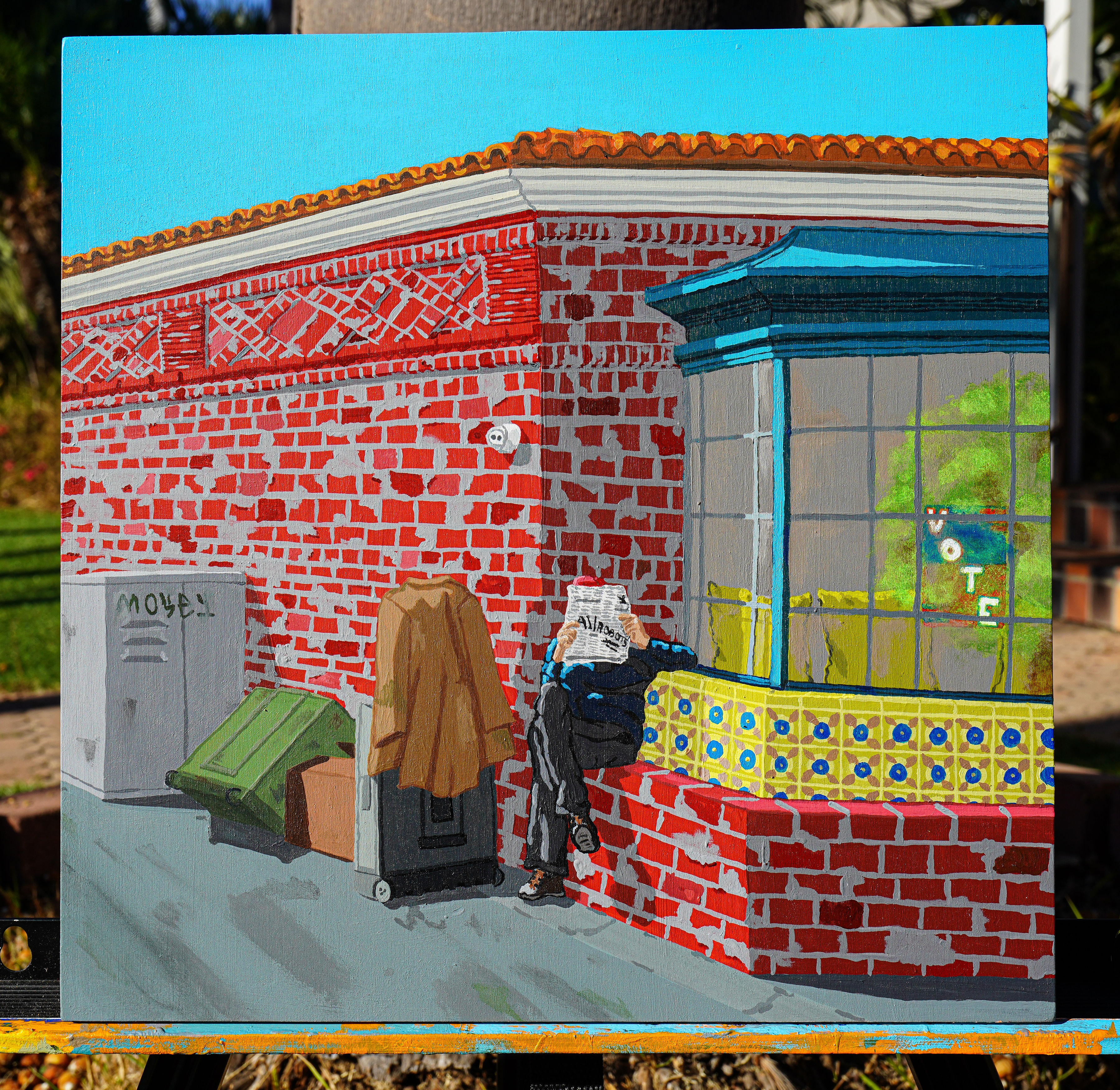Painted this in 2024 as the election season painfully crept along. Political dissonance at large. Red or blue, the state of things remains the same. Check your local city block corner for reference. While many politicians and media platforms focus in on contemporary “buzzword” subjects such as the rise of AI and surveillance, cities like LA still face a historic housing crisis that has yet to be seriously confronted by its leadership. It begs the question: who or what does our vote really serve?