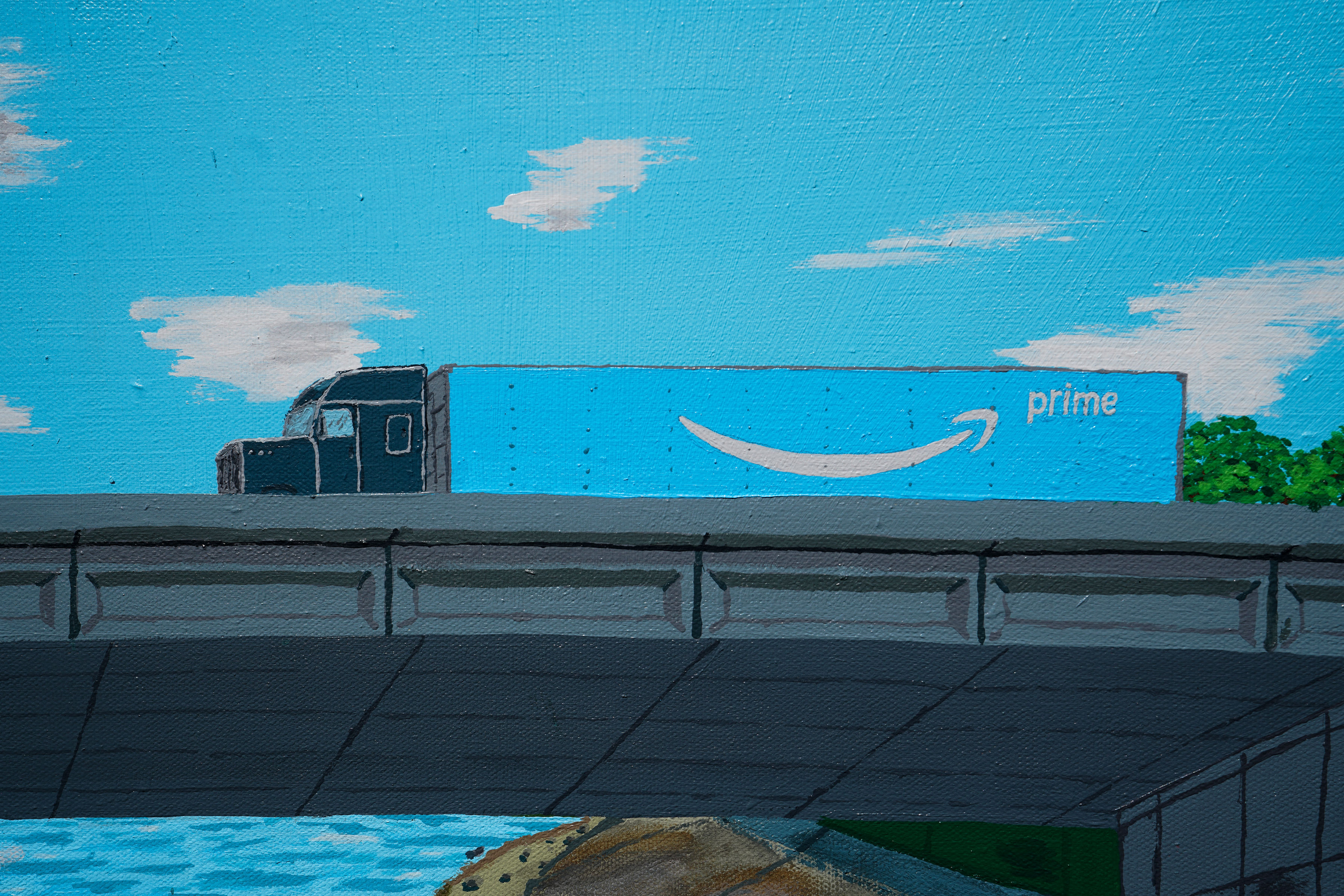 A common sight across LA neighborhoods, this painting is based off a freeway underpass just a few blocks down from where I live. These tracts of public land that slice through the city and enforce its hardlined neighborhood borders act as haphazard shelters for the houseless population.